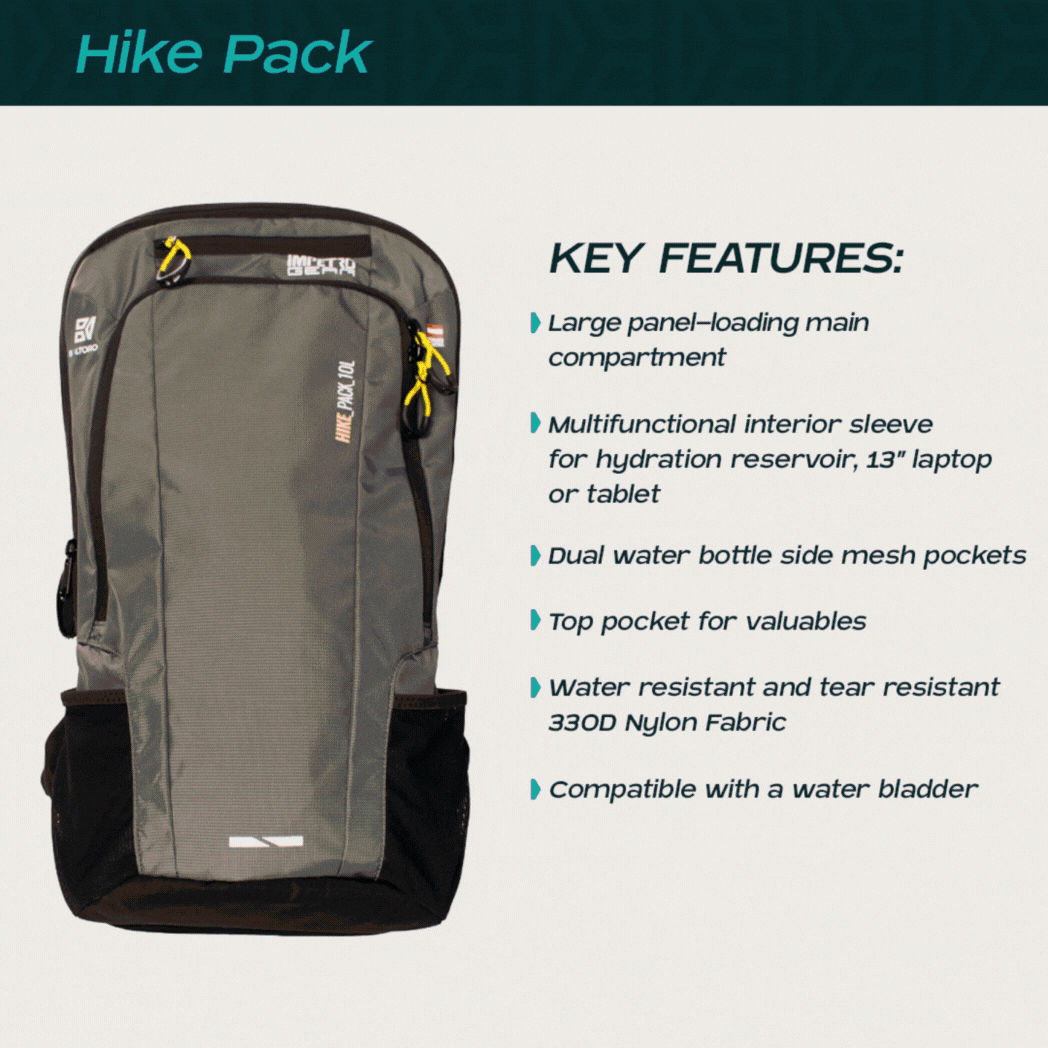 Want to hit that trail for an afternoon hike carrying only the bare essentials? Our starting 10 L Hike Pack allows you to do just that. Comfy and light, yet roomy enough to carry a jacket (or two), this backpack comes with two sides meshes for your water bottle(s) and favorite energy drink and a top pocket to keep your cell phone, keys or other essentials.